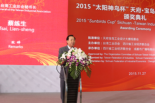 蔡練生在致辭中指出,“太陽神鳥杯”天府.寶島工業(yè)設計大賽已成為川臺兩地之間合作交流的一個重要平臺,促進了兩地科技產(chǎn)業(yè)的合作進步。他說,天府·寶島工業(yè)設計大賽舉辦五年來每年都有進步,期待大賽一年比一年辦得更好。他表示,臺灣工業(yè)總會將繼續(xù)致力于與四川方面共同推動兩地科技創(chuàng)新成果的轉化。