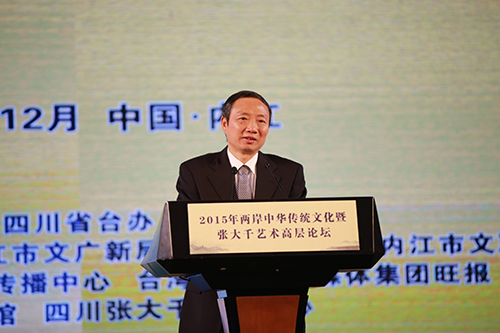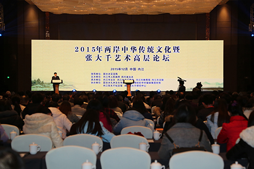 中國臺灣網12月28日內江訊 2015年12月24日至26日, 2015年兩岸中華傳統文化暨張大千藝術高層論壇在四川內江舉辦。四川省政府副秘書長陳越良宣布開幕,四川省臺辦主任周敏謙、內江市市長任曉春和中國國民黨中央評議委員會主席團主席張榮恭等出席開幕式并致辭,內江市委副書記周勇主持開幕式。蘇叔陽、魏明倫、黃光男、鄭愁予等來自海峽兩岸的文人名人、專家學者、臺商代表、青年學生等近200人參加。