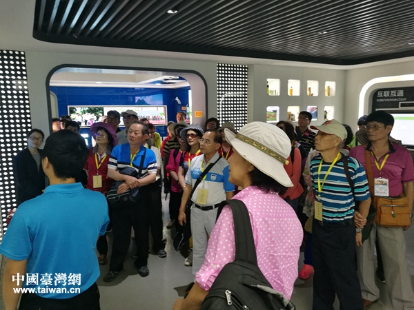 參訪團在石山互聯網農業小鎮中心大廳觀看宣傳片。(圖片來源:海南省臺辦)