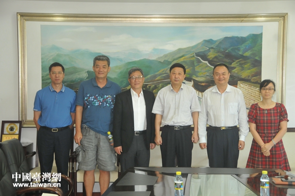 海南省臺辦主任劉耿(右三)、副主任何清(右二)與臺商陳建昇(左三)、薛亞偉(左二)等交流瓊臺現代農業合作。(圖片來源:海南省臺辦)