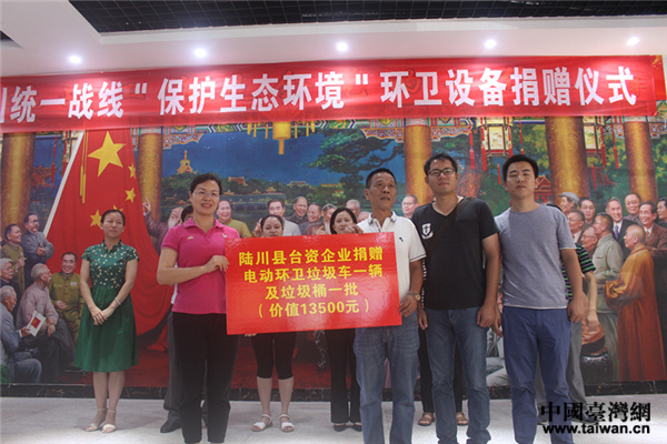 中國臺灣網6月20日陸川訊 6月15日,廣西玉林市陸川縣開展“保護生態環境,統一戰線在行動”系列專題活動,該縣7家臺資企業積極響應,參與當地生態文明建設,并捐贈價值13500元的電動環衛垃圾車一臺及垃圾桶一批。捐贈后,臺資企業代表還前往該縣溫泉鎮官田村開展清河大行動。