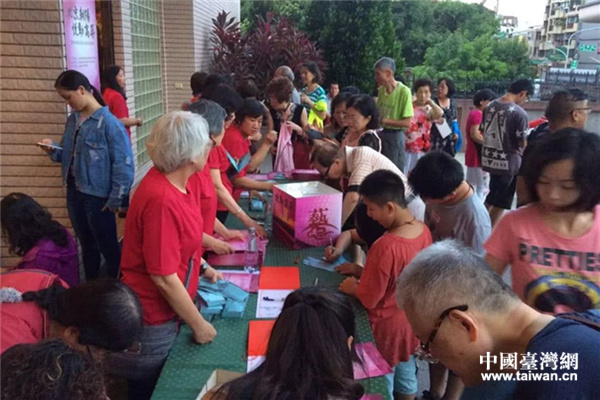 在屏東市屏榮高中禮堂的大門內,五張鋪著綠布的桌案一字排開,五位中華傳統(tǒng)文化技藝傳承人展示著各自的絕活,桌子前面擠滿了來參加“北京朝陽‘悅動屏東’社區(qū)文化大舞臺”的觀眾,有的一家老小分開來排隊,盼望著早點輪到自己體驗。