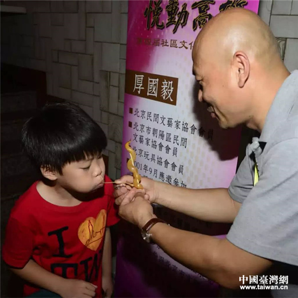 一位家長和孩子手中都拿著糖人,她告訴記者:“在臺灣,很少能看到這個吹糖人的。這次聽朋友說北京的藝人來屏東演出,能看到吹糖人的真是沒想到,自己也能吹糖人更是想不到了!