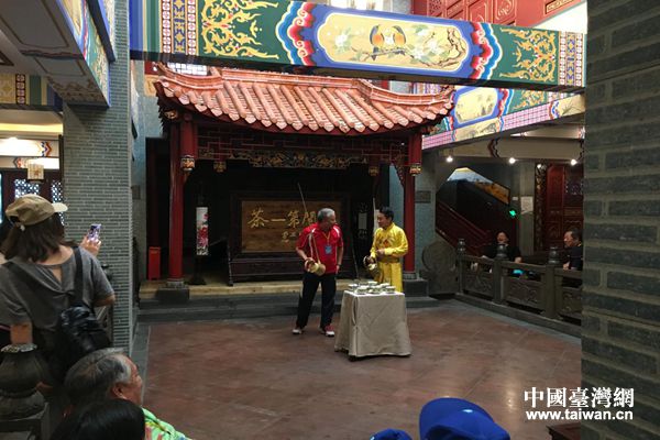 參訪團成員在茶藝師的指導下親自體驗茶藝“龍行十八式”(圖片來源:雅安市臺辦)