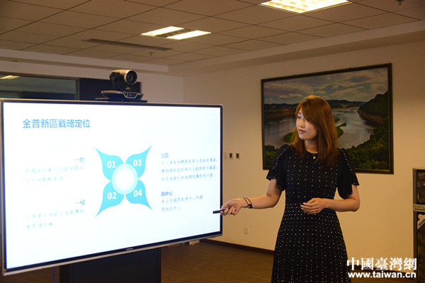 金普新區(qū)商務(wù)局相關(guān)負(fù)責(zé)人介紹金普新區(qū)情況。(圖片來(lái)源:遼寧臺(tái)辦)