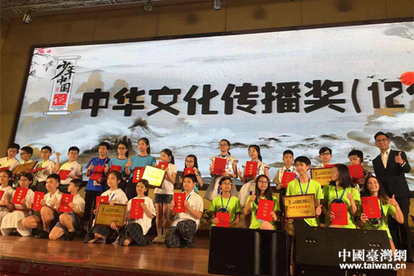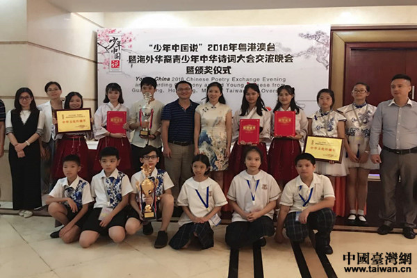 中國(guó)臺(tái)灣網(wǎng)7月31日江門訊 為貫徹落實(shí)黨的十九大精神以及“惠臺(tái)31條”措施要求,鼓勵(lì)臺(tái)灣同胞參與中華經(jīng)典誦讀工程等中華優(yōu)秀傳統(tǒng)文化傳承發(fā)展工程,廣東省江門市舉辦了“少年中國(guó)說”2018年粵港澳臺(tái)暨海外華裔青少年中華詩(shī)詞大會(huì)。7月12日當(dāng)天迎來了大會(huì)的總決賽,并舉行了頒獎(jiǎng)晚宴。江門市委常委、統(tǒng)戰(zhàn)部部長(zhǎng)易中強(qiáng),江門市委常委、宣傳部部長(zhǎng)周惠紅,江門市委臺(tái)辦主任譚健文等出席了晚會(huì),并向活動(dòng)的獲獎(jiǎng)個(gè)人、團(tuán)隊(duì)、團(tuán)體和熱心人士頒獎(jiǎng)。其中,江門市臺(tái)灣代表隊(duì)小學(xué)隊(duì)獲得了中華文化傳播獎(jiǎng),臺(tái)灣代表隊(duì)初中隊(duì)獲得了中學(xué)組二等獎(jiǎng)。