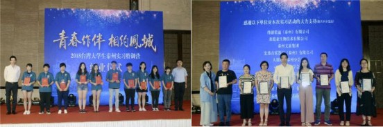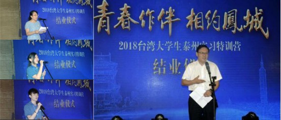 儀式上播放了“青春作伴 相約鳳城”精彩時光紀錄片以及同學們精心制作的微視頻作品。臺灣同學們用手機、相機和文字記錄下了在實習參訪過程中所見到的身邊人、身邊事以及美景,特別是學習京劇的精彩瞬間、過生日的感動畫面、工作實習的成果等等,用臺生專屬的視角表達了對美麗江蘇和幸福泰州的贊許。在剛剛結束的“我眼中的江蘇”隨手拍和主題征文大賽活動中,泰州市臺辦選送的作品,從全省臺灣大學生1214張攝影作品、86段短視頻以及102篇美文產生的46個獎項中脫穎而出,取得了優異的成績,獲得了省臺辦領導和兩岸大學生的一致肯定。