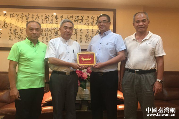 廣州市臺聯會長葉耀華(右二)與臺北市體育教育交流協會代表交換紀念品。(圖片來源:廣州市臺聯)