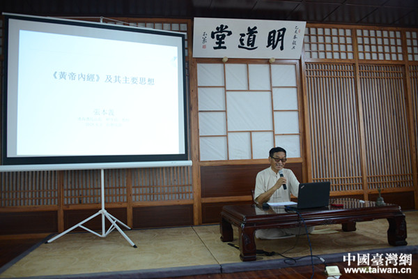 連海書院山長張本義先生為學(xué)員們詳盡解讀了《黃帝內(nèi)經(jīng)》中的《上古天真論》《四氣調(diào)神大論》以及《天年》等篇章中的中醫(yī)精髓思想。先生告訴我們?nèi)绾伪S小疤煺妗北拘裕绾潍@得內(nèi)心的安穩(wěn)與幸福;把握“法于陰陽,和于術(shù)數(shù),食飲有節(jié),起居有常,不妄作勞,形與神俱”的養(yǎng)生長壽要點(diǎn);用一張?zhí)珮O圖講解春、夏、秋、冬四季養(yǎng)生要義。張先生的授課內(nèi)容豐富、妙語連珠、引經(jīng)據(jù)典、深入淺出,學(xué)員們聽得津津有味,入心入神,同時張先生不失幽默風(fēng)趣的授課方式,引來聽眾陣陣會心大笑,掌聲不斷,讓聽者在不知不覺中領(lǐng)悟了中華文化的博大精深和無窮魅力。課后,大家紛紛表示,傳承和弘揚(yáng)中華傳統(tǒng)文化是兩岸青年的共同責(zé)任和義務(wù),今后要更加深入、系統(tǒng)的學(xué)習(xí)和研究中華傳統(tǒng)文化,讓中華文化在兩岸乃至世界發(fā)揚(yáng)光大。