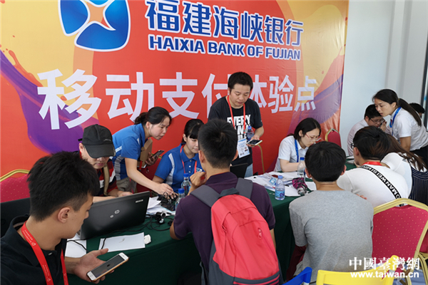 在海峽青年交流營地,臺灣青年排隊辦理移動支付。(中國臺灣網 郜利敏 攝)