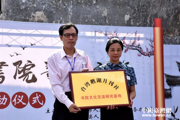 臺灣鵝湖月刊社向鉛山鵝湖書院頒發研究基地牌匾。(圖片來源:上饒市臺辦)