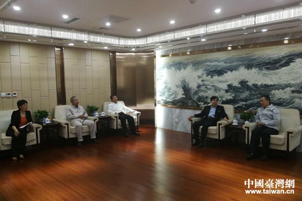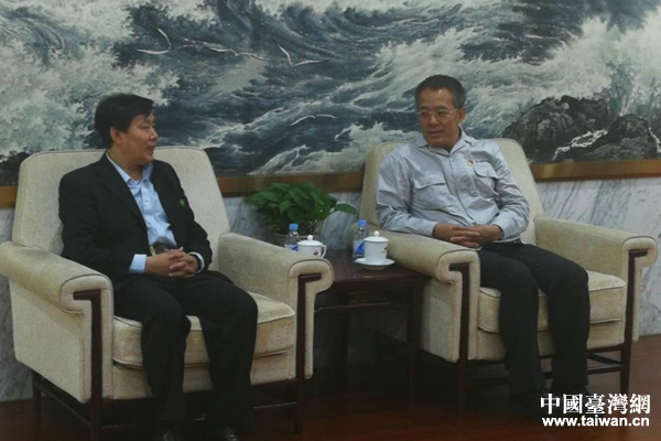 遼寧省臺辦副主任李成山與鞍鋼集團有限公司黨委副書記栗寶卿座談交流。(圖片來源:遼寧省臺辦)