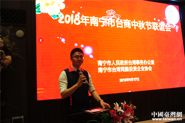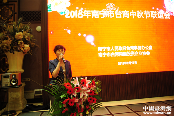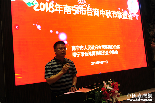 中國臺灣網9月25日南寧訊 近日,廣西南寧市舉辦2018年南寧市臺商中秋聯誼會,南寧市有關部門代表與南寧市臺商代表、臺協會員及家屬共260多人歡聚一堂,共慶佳節敘親情,共享商機謀發展。廣西臺辦主任李東興、南寧市政府副秘書長蒙文虎出席聯誼會并致辭。