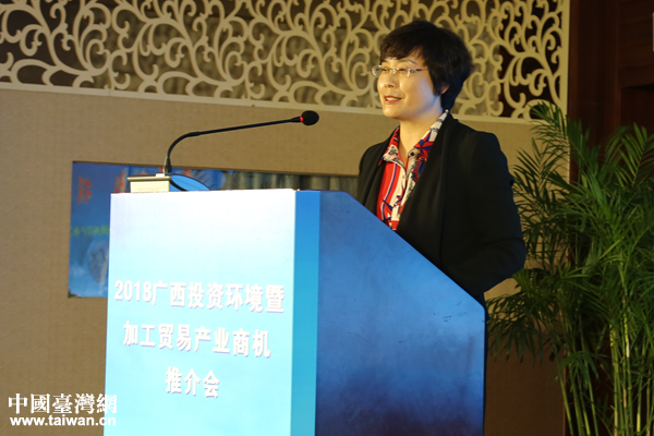 中國臺灣網11月12日蘇州訊 11月6日,“2018年廣西投資環境暨加工貿易產業商機推介會”在江蘇省蘇州市舉辦,廣西臺辦主任李東興作推介發言,向與會120多家臺資企業負責人推介廣西海峽兩岸產業合作區的規劃背景、區域范圍、發展定位、發展目標、突出優勢、合作領域和優惠政策。