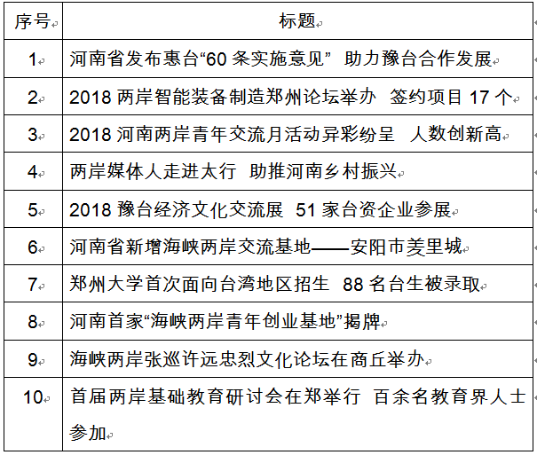 “2018年河南省涉臺十大新聞”