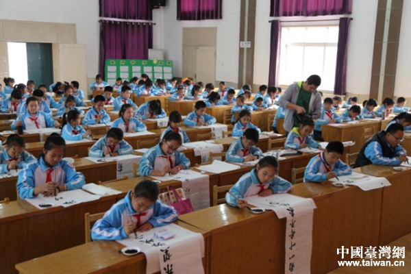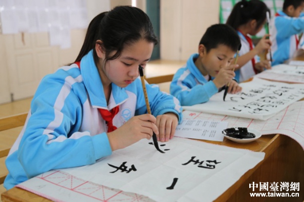 塘沽中心莊小學200名書法小選手現場競技,用筆墨向海峽傳遞著濃濃的情懷。(圖片來源:天津市臺辦)