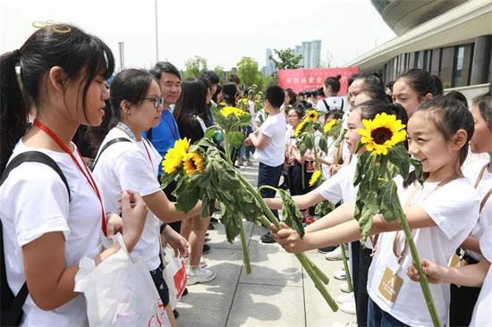 當(dāng)天上午,作為小小“東道主”,江蘇大劇院童聲合唱團(tuán)的團(tuán)員們,為遠(yuǎn)道而來的朋友們舉行了歡迎儀式,向他們贈送了代表陽光與熱情的向日葵,并合影留念。