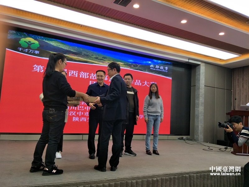 會上為獲得“西部故事”原創作品大賽代表頒發獎品。(圖片來源:甘肅省臺辦)