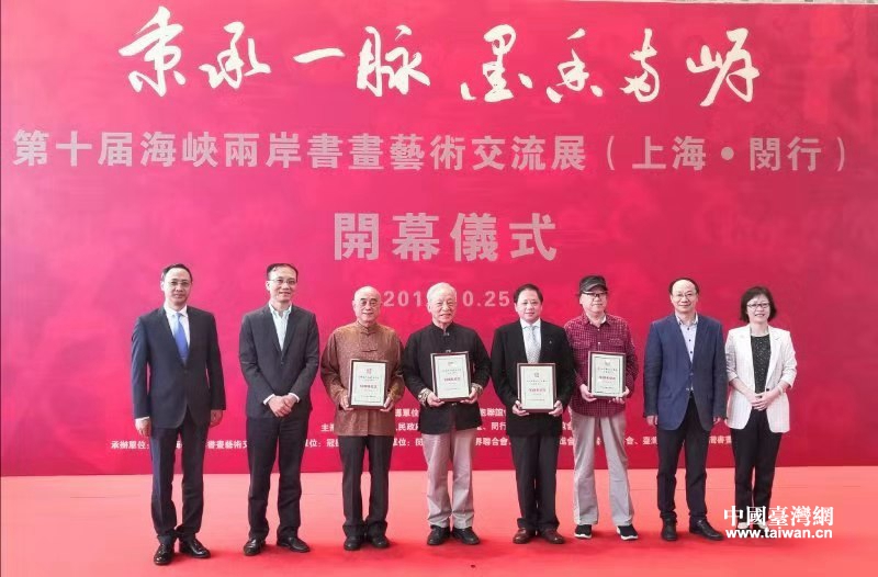 中國臺灣網10月28日訊 秋天的申城大地景致正美。10月25日上午,由上海海峽兩岸書畫藝術交流會承辦,閔行區文聯、臺灣光彩促進會、臺灣祥簋書會、臺灣中華畫院、臺灣書畫篆刻研究會協辦的“秉承一脈墨香兩岸”——第十屆海峽兩岸書畫藝術交流展(上海.閔行)在海派藝術館開幕。來自臺灣的27名書畫藝術家、上海海峽兩岸書畫藝術交流會30多名書畫藝術家、閔行區各街、鎮、莘莊工業區黨委(黨工委)、臺聯分會長、市臺協會閔行工委會負責人和臺商、臺胞代表近三百人參加。