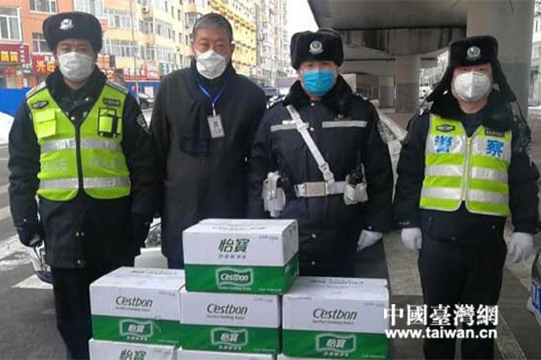 臺灣中華時報社副總編潘劍松與黑龍江省臺辦工作人員共赴疫情防控一線,向哈爾濱市公安局南崗分局、哈爾濱市交警支隊公安干警表示親切的慰問,并捐贈礦泉水200箱。(圖片來源:黑龍江省臺辦)