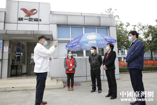 李東興、趙宏明在南寧統(tǒng)一企業(yè)有限公司查看企業(yè)防護(hù)措施和防控物資儲(chǔ)備情況。 (中國臺(tái)灣網(wǎng) 發(fā))