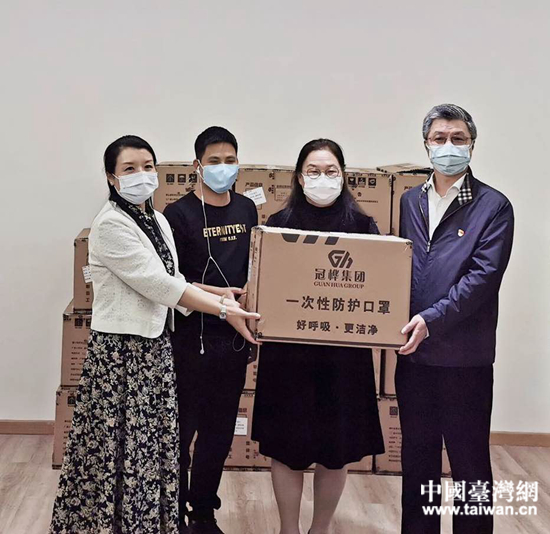 曾衛東向伯峰茶業,米樂嘉餐飲兩家臺企代表贈送防護口罩。 (中國臺灣網 發)