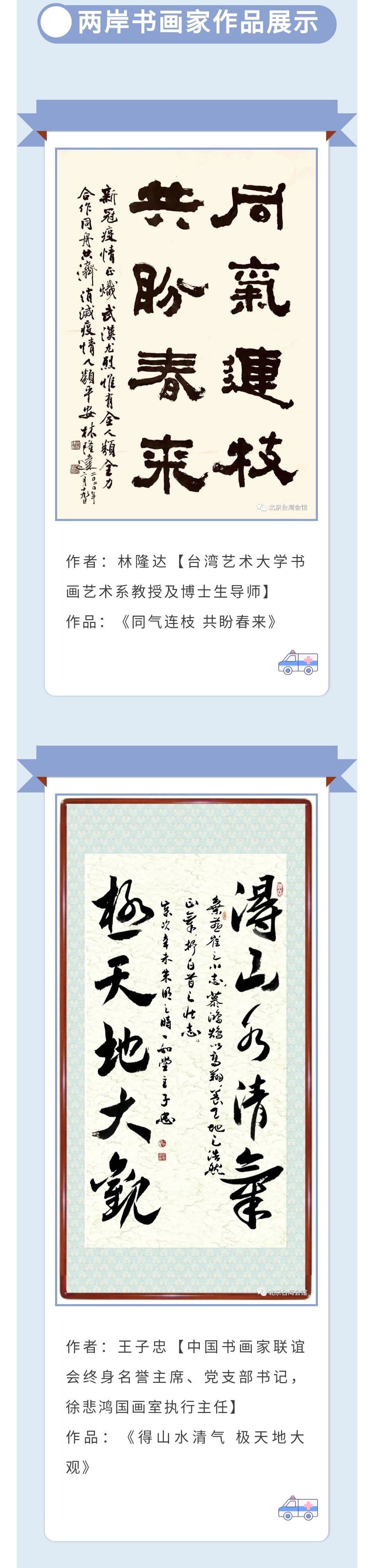 這些作品中,有以《同氣連枝 共盼春來》《青山一道同云雨 明月何曾是兩鄉》等為主題的飽含同胞之情、體現血脈相連的書法作品,也有向戰斗在一線醫務工作者致敬、為偉大中華祈福的書畫作品;作品將分為兩期,在北京臺灣同胞聯誼會網站和公眾號,北京臺灣會館公眾號及中國書畫家聯誼會微信公眾號、官方微博、網站共同展出。(中國臺灣網、北京市臺聯 聯合報道)