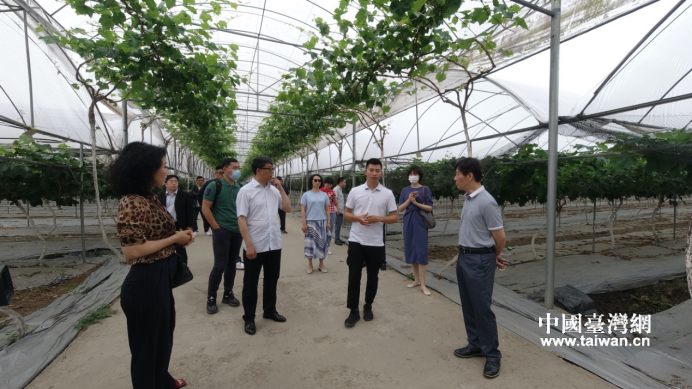 臺資農(nóng)企負(fù)責(zé)人、農(nóng)業(yè)專家在彭山區(qū)葡萄產(chǎn)業(yè)現(xiàn)代農(nóng)業(yè)園區(qū)交流葡萄種植技術(shù)。(圖片來源:四川省臺辦)