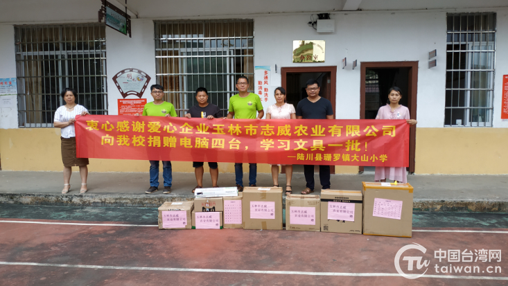 玉林市志威農業(yè)有限公司向陸川縣珊羅鎮(zhèn)大山小學捐贈愛心物資(圖片來源:廣西玉林市臺辦)