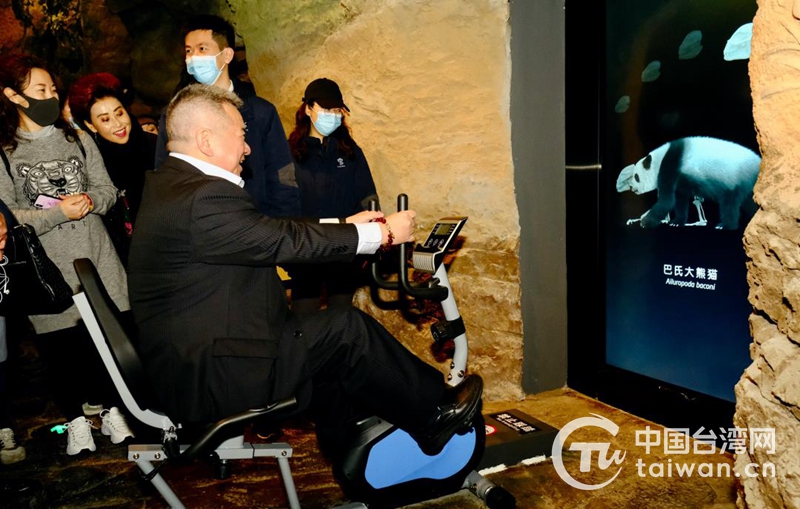 成都臺協會會長高錦樂體驗踩腳踏車看熊貓演變史。(圖片來源:四川省臺辦)