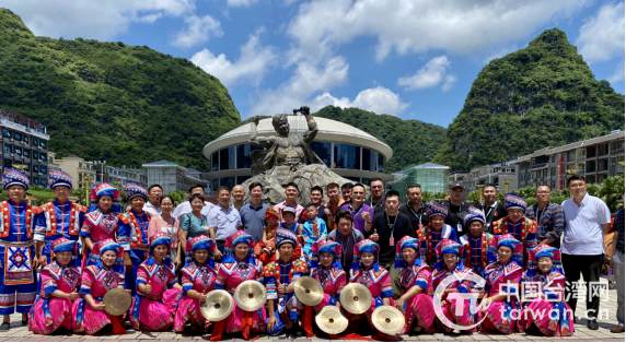 臺青參訪團(tuán)與馬山會鼓表演者合影。(圖片來源:廣西臺辦)