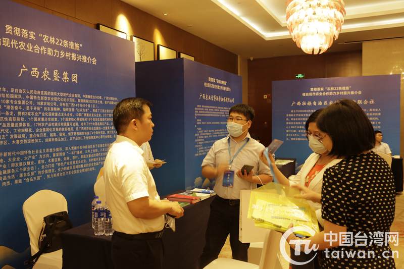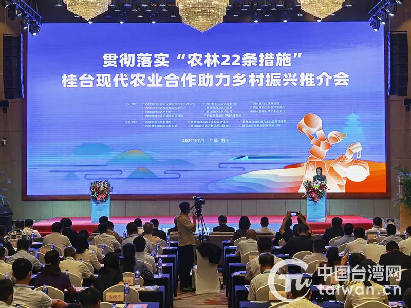 中國臺灣網7月21日訊 7月19日,廣西壯族自治區臺辦、農業農村廳、林業局等17家單位在廣西南寧共同舉辦“貫徹落實‘農林22條措施’桂臺現代農業合作助力鄉村振興推介會”,探索“十四五”桂臺現代農業合作方向、路徑和模式,引導涉農臺資企業適應新發展階段,貫徹新發展理念,融入新發展格局,積極參與鄉村振興戰略,扎實推動桂臺農業融合發展邁上新臺階。國家有關部門業務負責人,兩岸從事農業及相關產業企業家代表,兩岸專家、學者,廣西壯族自治區及各市相關主管部門代表,涉農金融機構代表等150余人出席會議。