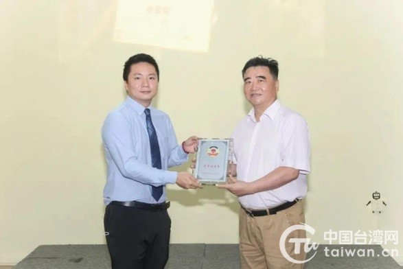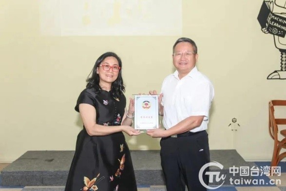 鐘慕慧接過工作站牌(圖片來源:昆山市臺辦)