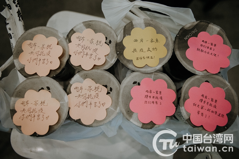 原來,昆山開發(fā)區(qū)“兩岸一家親”臺胞志愿者服務隊的成員林芝羽,和 “注春”奶茶店昆山地區(qū)負責人賴俊男商議,想為醫(yī)護人員免費贈送暖心奶茶。8月19日正逢醫(yī)師節(jié),臺胞志愿者們來到奶茶店,一邊幫著打包奶茶,一邊為每杯奶茶貼上手寫的便利貼。“兩岸一家親,感謝你們,祝醫(yī)師節(jié)快樂”……一張張小小的便利貼,寄托了臺胞真誠的祝福和感謝。