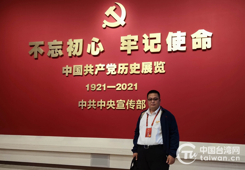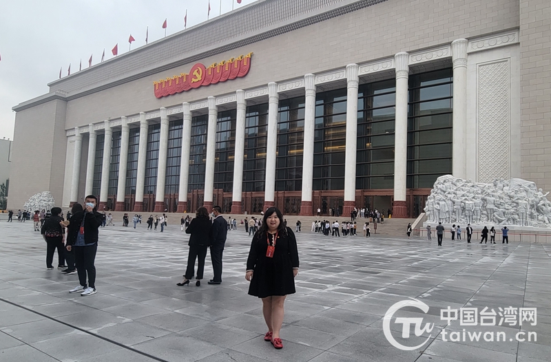 王孟筠在中國共產(chǎn)黨歷史展覽館前留影(圖片來源:廣西臺辦)