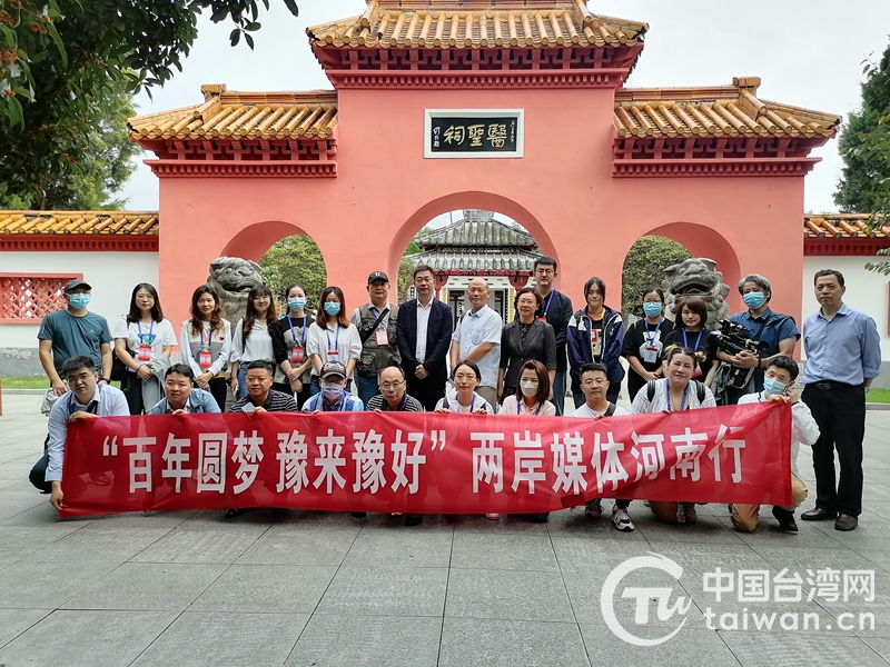 兩岸記者在醫圣祠大門外合影留念(圖片來源:河南省臺辦)