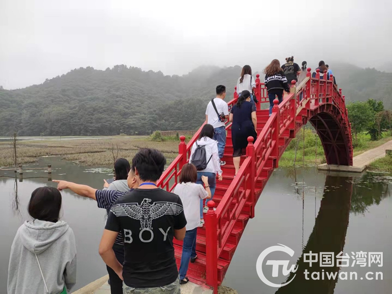 兩岸記者走在睡仙橋村紅色木橋上(圖片來源:河南省臺辦)
