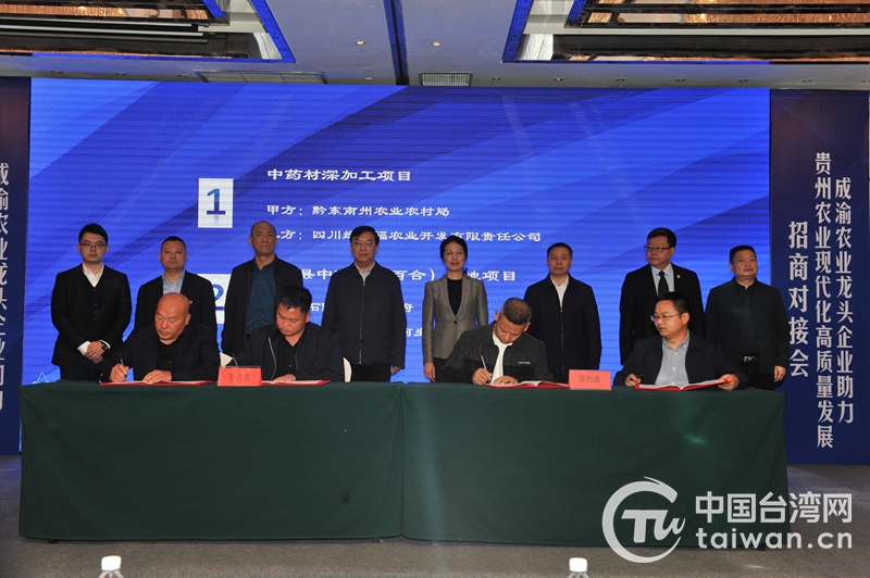 中國臺灣網10月26日訊 近日,由貴州省農業農村廳、貴州省投資促進局、貴州省政府臺灣事務辦公室共同主辦,遵義市農業農村局、銅仁市農業農村局、六盤水市農業農村局、黔東南州農業農村局、四川省農業龍頭企業協會協辦的“成渝農業龍頭企業助力貴州農業現代化高質量發展招商對接會”在四川成都成功舉行。川渝黔多家企業就中藥材、食用菌、金銀花等精深加工和農業基地建設項目現場簽約,涉及投資金額3億元。