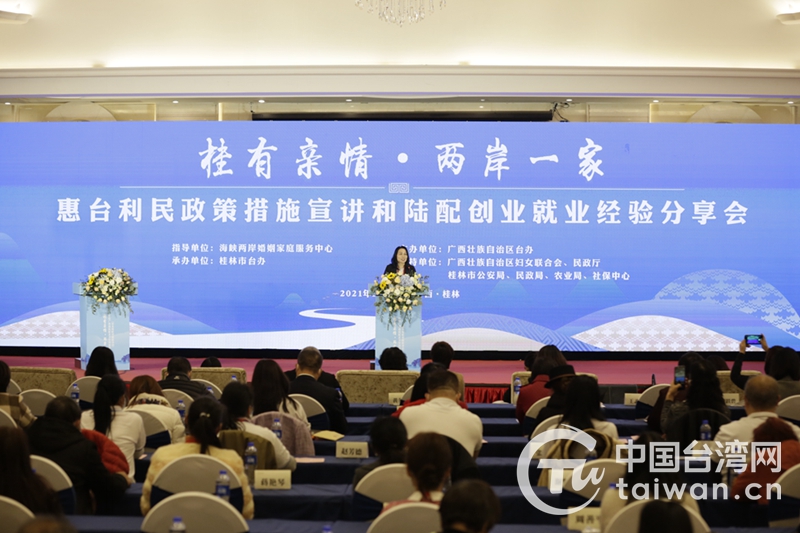 桂林市委常委蔣育亮表示,目前,桂林有臺胞投資企業400多家,涉臺婚姻1.6萬多對,是臺灣同胞青睞有加、追夢圓夢的創業樂園、投資福地。桂林把真心真情融入到涉臺的各項工作中,積極出臺惠臺利民政策措施在當地的落實辦法,讓臺胞充分享受同等待遇。歡迎臺灣同胞前來共享桂林建設世界級旅游城市發展機遇和紅利,共同融合發展。