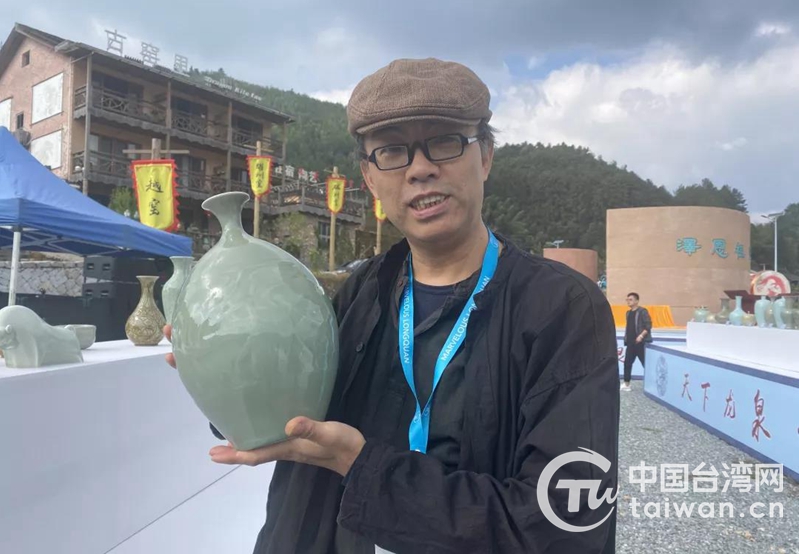 臺灣陶藝家谷源濤手捧其作品“行草紋小口瓶” (圖片來源:麗水龍泉市臺辦)
