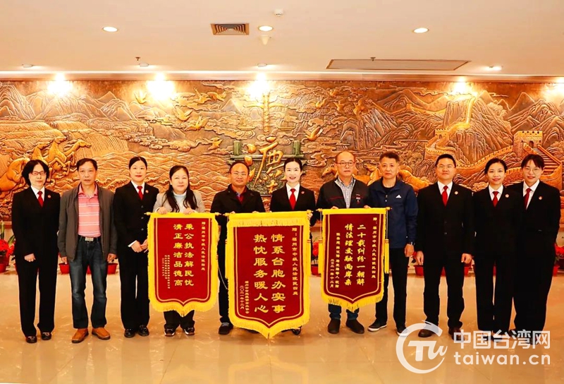 中國臺灣網12月23日訊 20日上午,福州市臺協會會長和臺胞當事人代表分別向福州中院民四庭贈送兩面內容為“情系臺胞辦實事 熱忱服務暖人心”“二十載糾紛一朝解 情法理交融兩岸親”的錦旗。