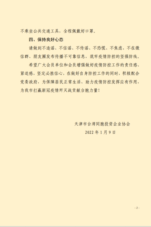 天津市臺企協(xié)會(huì)號召會(huì)員堅(jiān)決服從疫情防控部署,為打贏疫情防控殲滅戰(zhàn)貢獻(xiàn)力量
