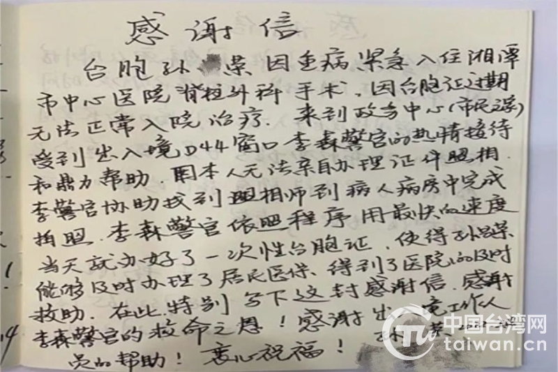 中國臺灣網(wǎng)3月11日訊 近日,臺胞孫某榮委托其親屬將手寫的感謝信送到了市民之家湘潭公安專區(qū)出入境窗口民警手中,以表達(dá)對湘潭公安民警的感激之情。