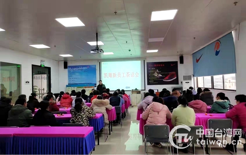 中國臺灣網4月11日訊 近日,在臺企東安縣凱翔鞋業有限公司,負責人分批次組織新入職員工舉行茶話會。剛入職的唐女士說,以前在外地打工時,最怕的就是給家中的孩子打電話。今年她經過多方考量,選擇了在家鄉的凱翔鞋業工作,不僅就近就業,還能更好地照顧孩子。