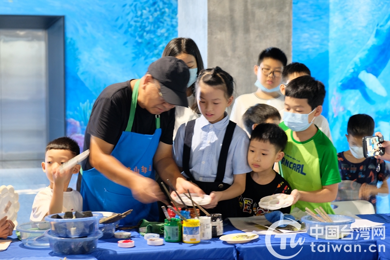 非遺項目傳承人教授魚拓畫制作方法(圖片來源:寧波市臺辦)