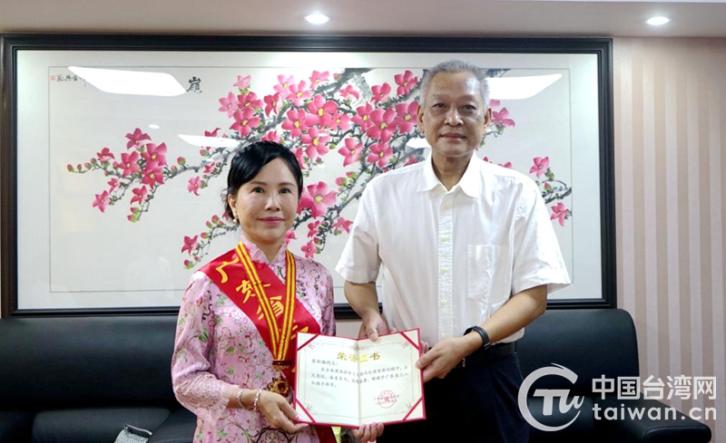 臺胞翁秋梅獲頒“廣東省三八紅旗手”榮譽(yù)證章(圖片來源:廣東省臺辦)