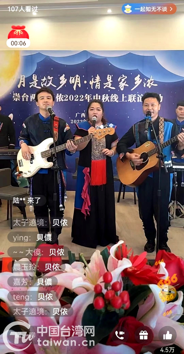 中國(guó)臺(tái)灣網(wǎng)9月13日訊 “太喜歡這樣的活動(dòng)了,不僅聽(tīng)到了熟悉的鄉(xiāng)音,看到了家鄉(xiāng)的美好變化,還感受到了來(lái)自家鄉(xiāng)親人的關(guān)懷與溫暖,希望這樣的活動(dòng)多多舉辦。”近日,廣西崇左市舉辦以“月是故鄉(xiāng)明·情是家鄉(xiāng)濃”為主題的“崇臺(tái)兩岸貝儂”2022年中秋線(xiàn)上聯(lián)誼活動(dòng),與100多名遠(yuǎn)嫁臺(tái)灣的陸配在線(xiàn)上共慶佳節(jié),參加活動(dòng)的陸配紛紛留言作上述表示。