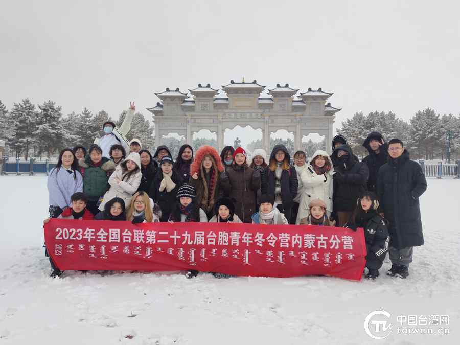 營員們在內(nèi)蒙古自治區(qū)首個獲批的國家級海峽兩岸交流基地——成吉思汗陵外合影。(中國臺灣網(wǎng) 高嘉鴻 攝)