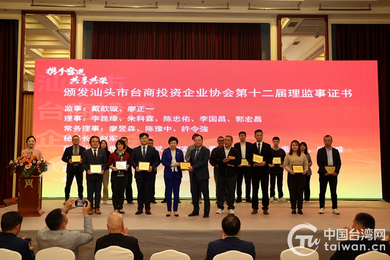 為第十二屆理監(jiān)事會頒發(fā)證書(圖片來源:汕頭市臺辦)