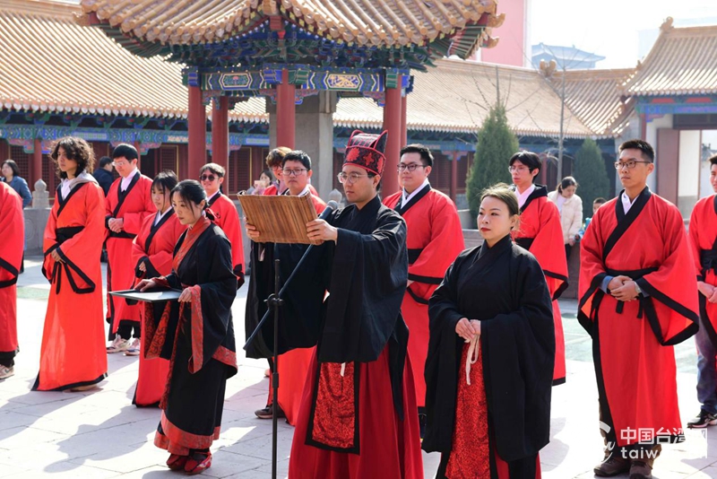 住濟臺生身著漢服,體驗拜孔簡禮(濟南市臺辦供圖)